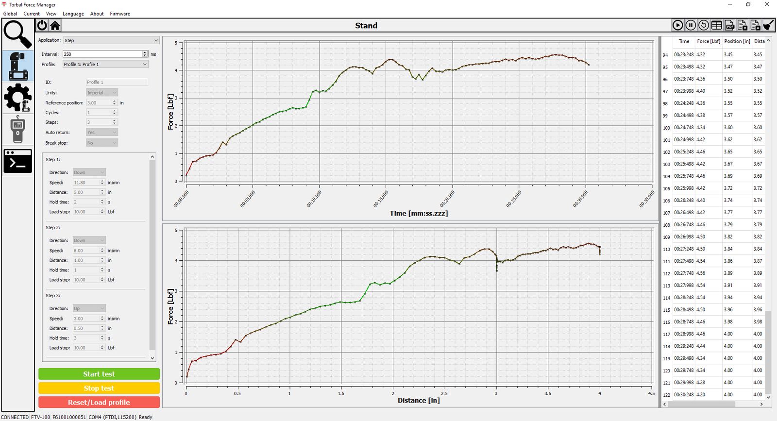 The "Step" feature in the software elevates test stand precision and analysis. It collects, saves, and graphs force measurements for each programmed test step, ensuring precise data capture. Two graphs are generated: one illustrating force changes over time, offering a dynamic view of the test's progression, and the other showing force behavior relative to the movement or position of the test element.